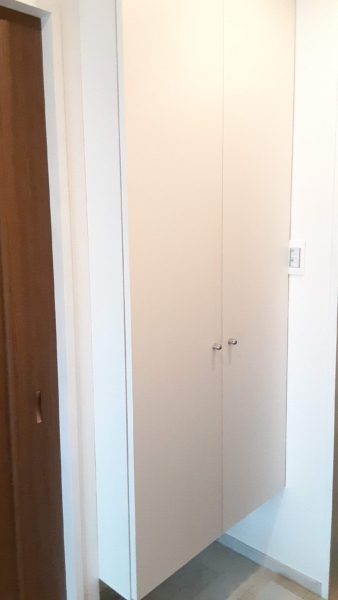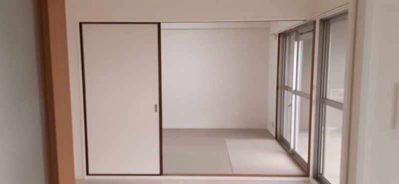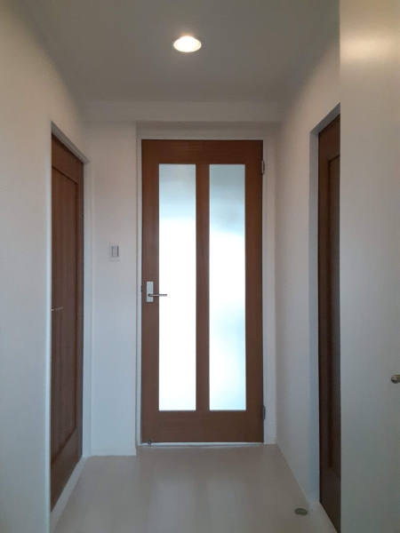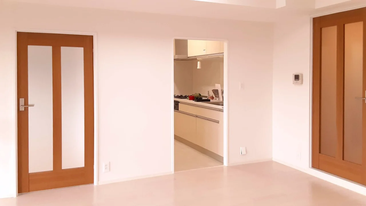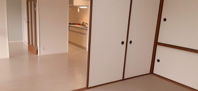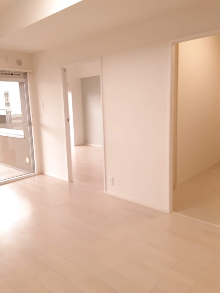 築年数の古いマンションですが、和室・洋室・リビングの南向き3面ワイドスパン間取りを活かし、ホワイトベースの改装プランニングを考えました。 改装工事:1ヶ月(部分改修) フローリング:ハーモニックホワイト 扉:ライトブラウン(枠:ホワイト)