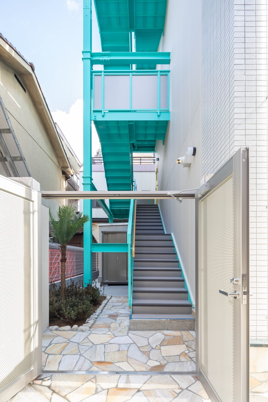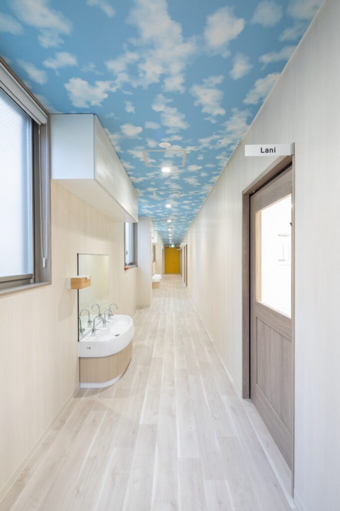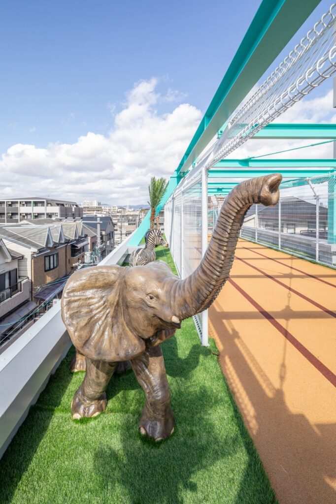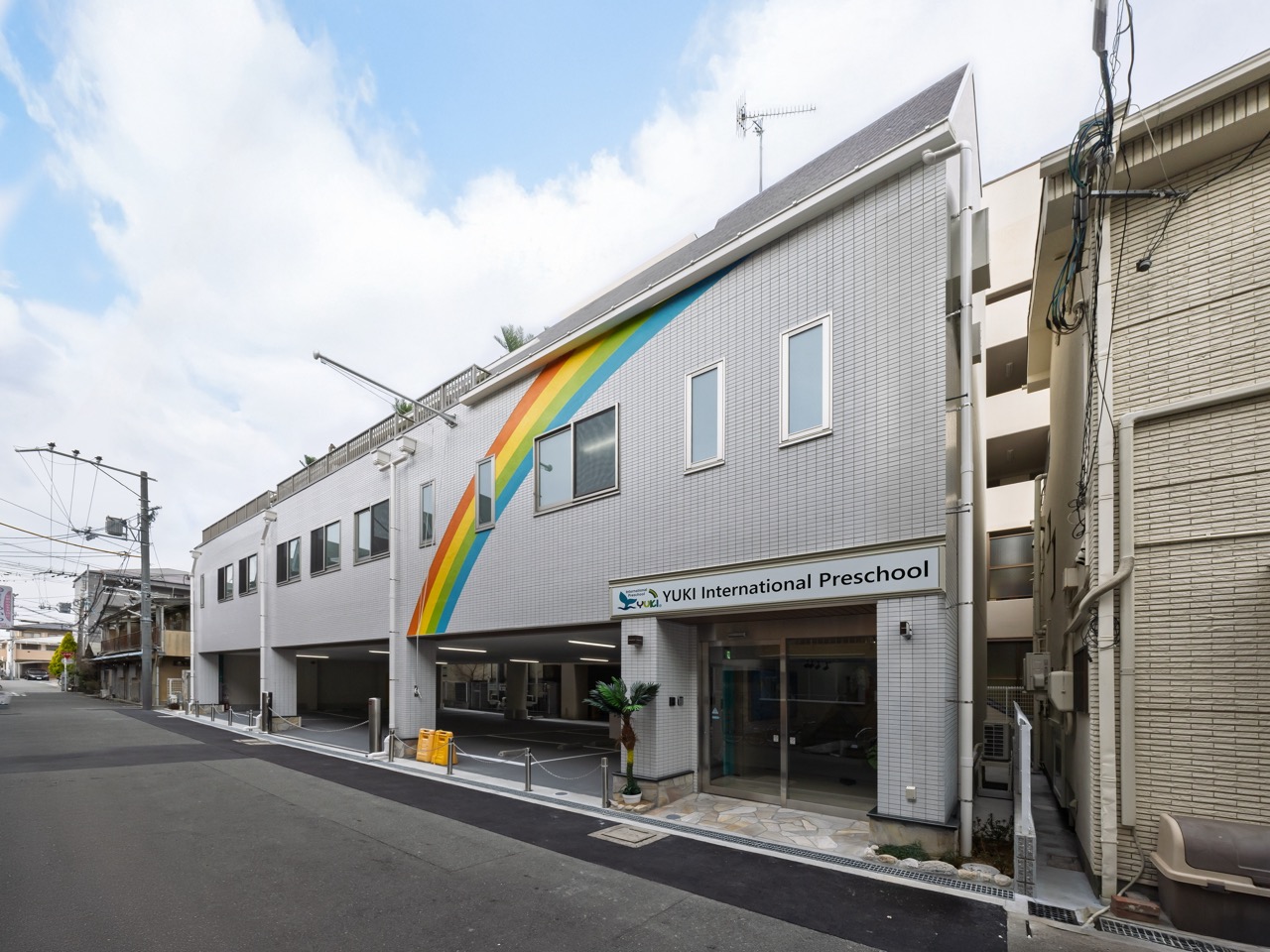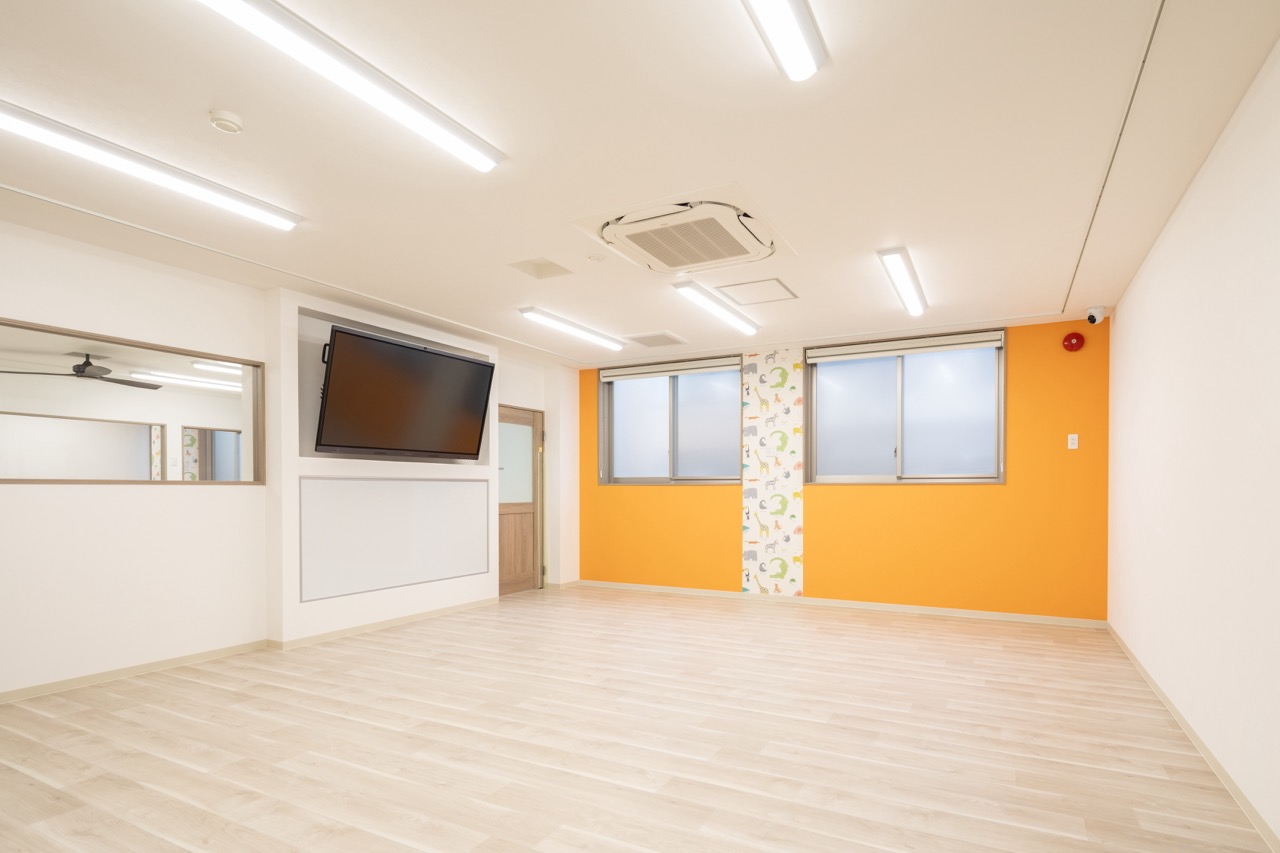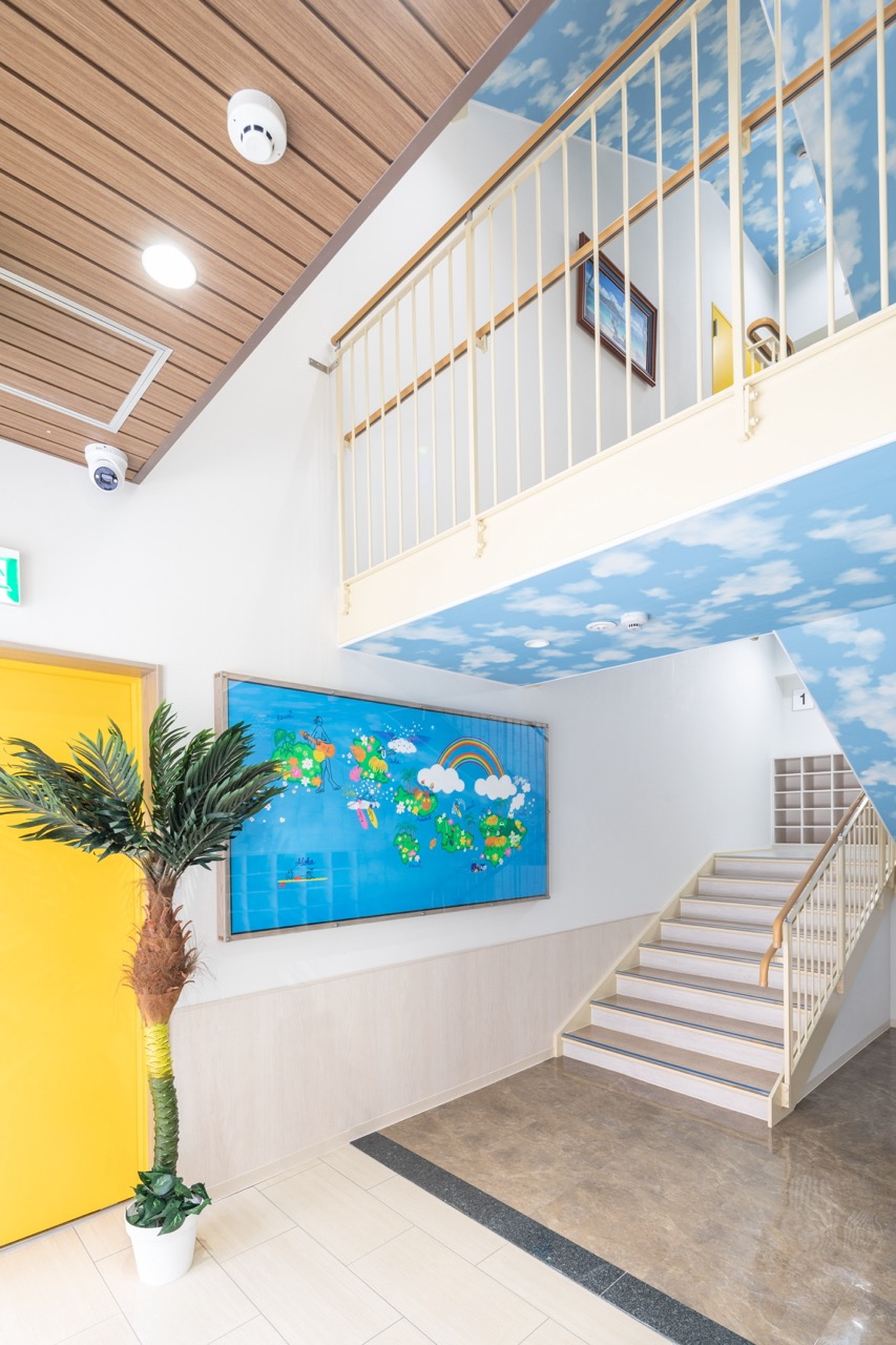 子供達がのびのびと英語を学べる大きな空間の教室を2階・3階に作り、 屋上では自由に走り回れて、転んでも大丈夫なようにゴムチップの床を採用しました。